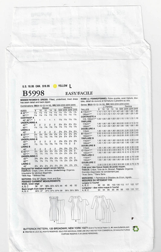 Butterick 5998 Womens Curvy Color Blocked Dress Out Of Print Sewing Pattern Size 8 - 16 UNCUT Factory Folded