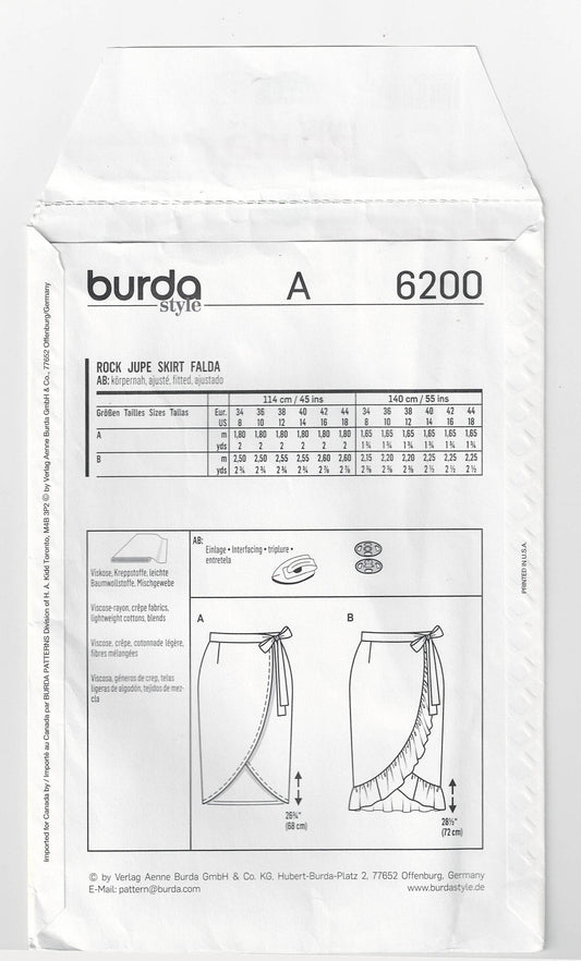Burda 6200 Womens EASY Wrap Skirts Out Of Print Sewing Pattern Sizes 8 - 18 UNCUT Factory Folded