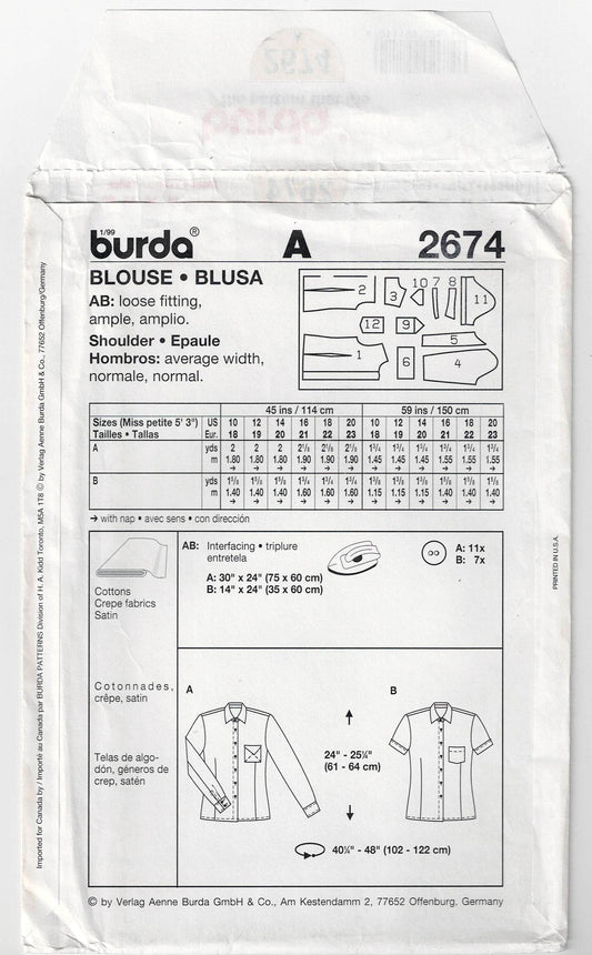 Burda 2674 Womens Classic Button Front Shirt/Blouse Out Of Print Sewing Pattern Sizes 10 - 20 UNCUT Factory Folded