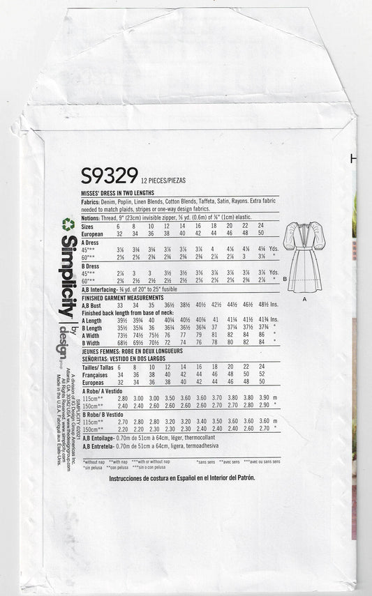 Simplicity 9329 MIMI G DESIGN Womens Puffy Sleeved Dresses Sewing Pattern Size 6 - 24 UNCUT Factory Folded