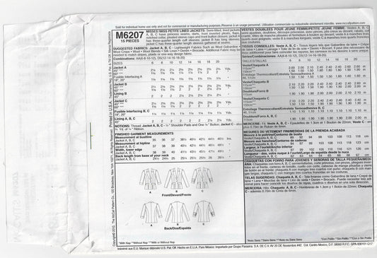 McCall's 6207 Womens Lined Jackets Out Of Print Sewing Pattern Sizes 6 - 12 UNCUT Factory Folded