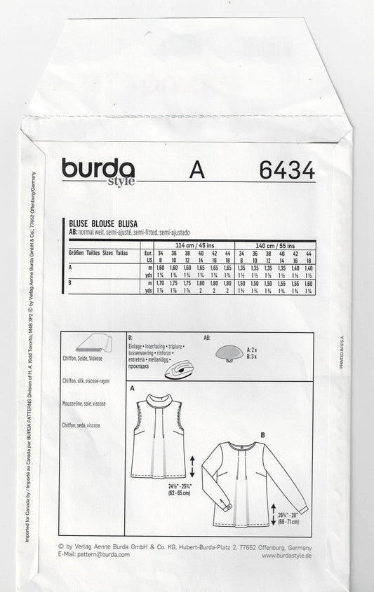 Burda 6434 Womens Pleated Pullover Tops Sewing Pattern Sizes 8 - 18 UNCUT Factory Folded
