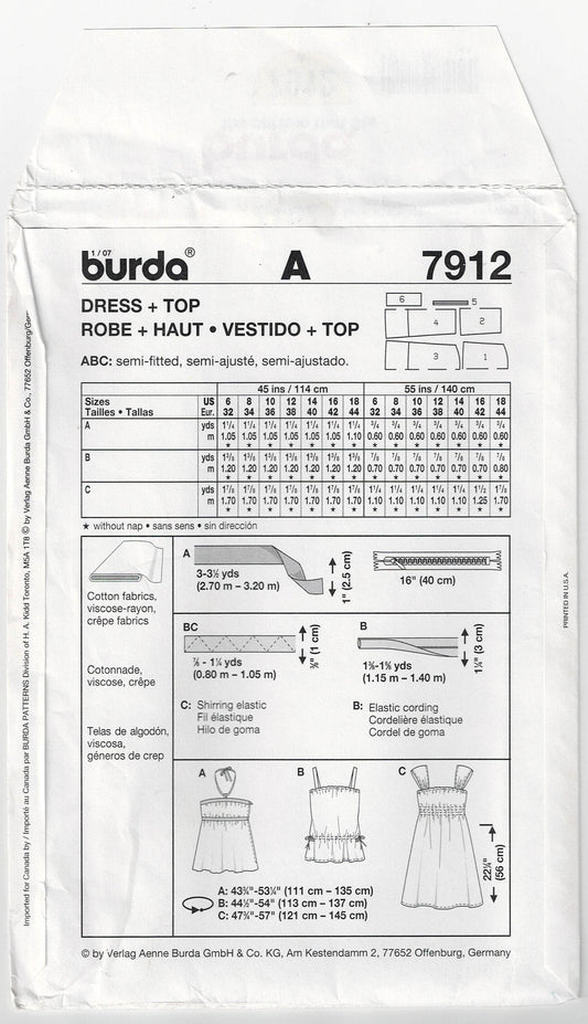 Burda Young 7912 Womens Gathered Summer Top Bustier & Dress Out Of Print Sewing Pattern Sizes 6 - 18 UNCUT Factory Folded