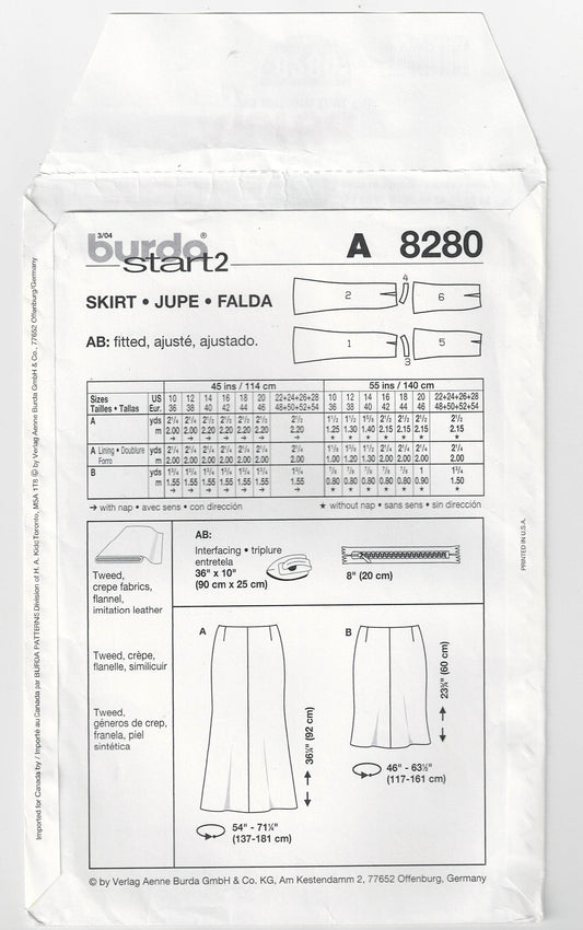Burda 8280 Womens Slim Beginner Skirt Out Of Print Sewing Pattern Sizes 10 - 28 UNCUT Factory Folded