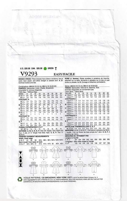 Patrón de costura para vestido con cintura atada y corpiño cruzado para mujer Vogue Easy Options 9293, talla 6-14, sin cortar, doblado de fábrica