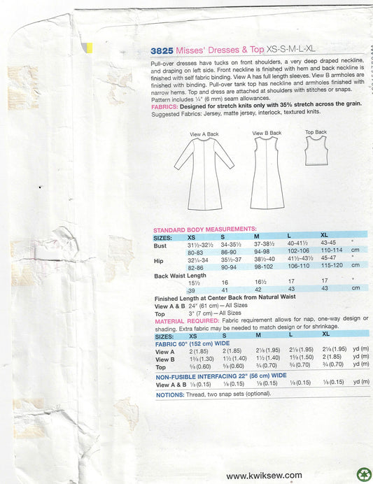 Kwik Sew 3825 Womens Stretch Knit Asymmetric Draped Dress Out Of Print Sewing Pattern Size XS - XL UNCUT Factory Folded
