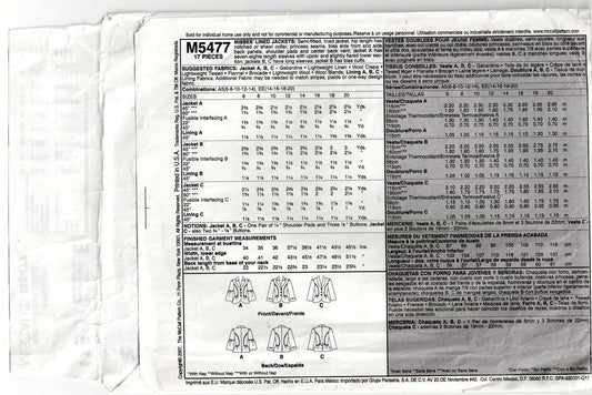 McCall's 5477 Womens Shaped Lined Jacket with Ruffles Out Of Print Sewing Pattern Size 14 - 20 UNCUT Factory Folded