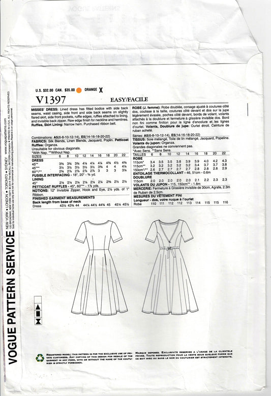 Vogue American Designer 1397 TRACY REESE Womens Lined V Back Dress with Front Pockets Out Of Print Sewing Pattern Sizes 6 - 14 UNCUT Factory Folded