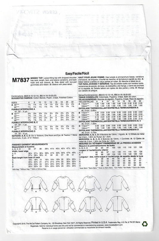 McCall's 7837 Womens Dropped Shoulder Tops with Sleeve Variations Out Of Print Sewing Pattern Sizes 6 - 14 UNCUT Factory Folded