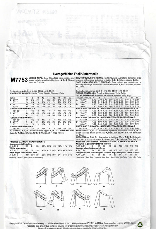 McCall's 7753 Womens Asymmetric Bare Shoulder Tops Out Of Print Sewing Pattern Sizes 6 - 14 UNCUT Factory Folded