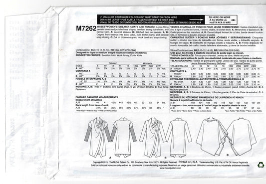 McCall's 7262 Womens Stretch Knit Cape Jacket & Poncho Out Of Print Sewing Pattern Sizes 8 - 16 UNCUT Factory Folded