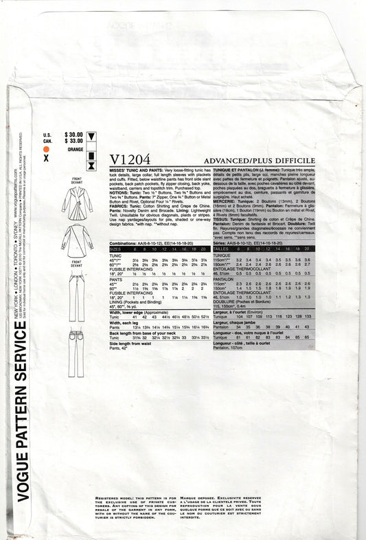 Vogue Designer Original 1204 ISSEY MIYAKE Womens Asymmetric Pleated Tunic Top & Hipster Pants or Jeans Out Of Print Sewing Pattern Size 6 - 12 UNCUT Factory Folded