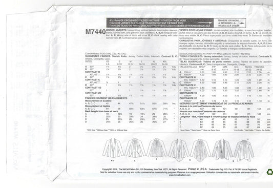 McCall's 7440 Womens EASY Stretch Knit Flared Jackets Out Of Print Sewing Pattern Sizes L - XXL UNCUT Factory Folded