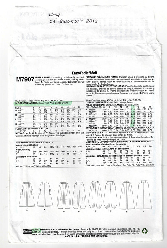 McCall's 7907 Womens Loose Fitting Pants with Leg Variations Sewing Pattern Sizes 6 - 14 UNCUT Factory Folded