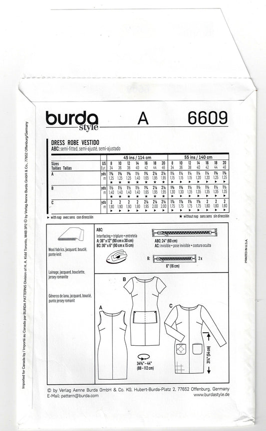 Burda Style 6609 Womens EASY Pullover Shift Dress with Pockets Sewing Pattern Sizes 8 - 20 UNCUT Factory Folded