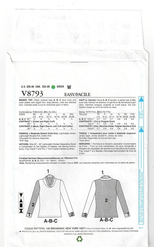Patrón de costura original de diseñador Vogue V8793 KATHERINE TILTON para blusas elásticas con bloques de color para mujer, agotado, talla XS a M, sin cortar, doblado de fábrica