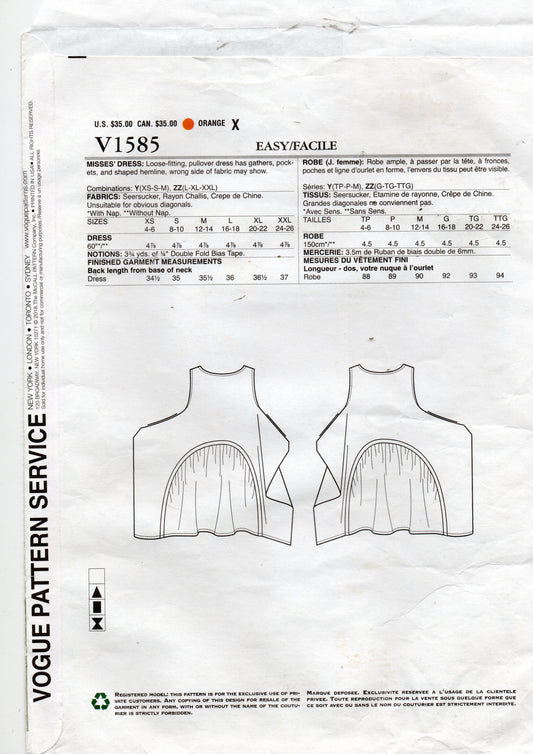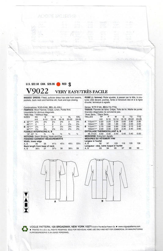 Very Easy Vogue 9022 Womens Pullover Dress with Pockets Out Of Print Sewing Pattern Sizes 16 - 26 UNCUT Factory Folded