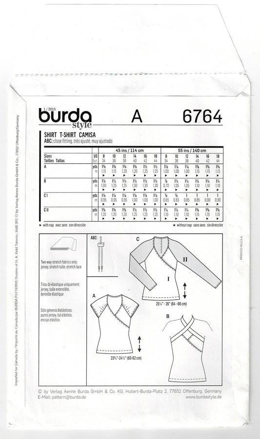 Burda Style 6764 Womens 2 Way Stretch Knit Tops Out Of Print Sewing Pattern Sizes 8 - 18 UNCUT Factory Folded