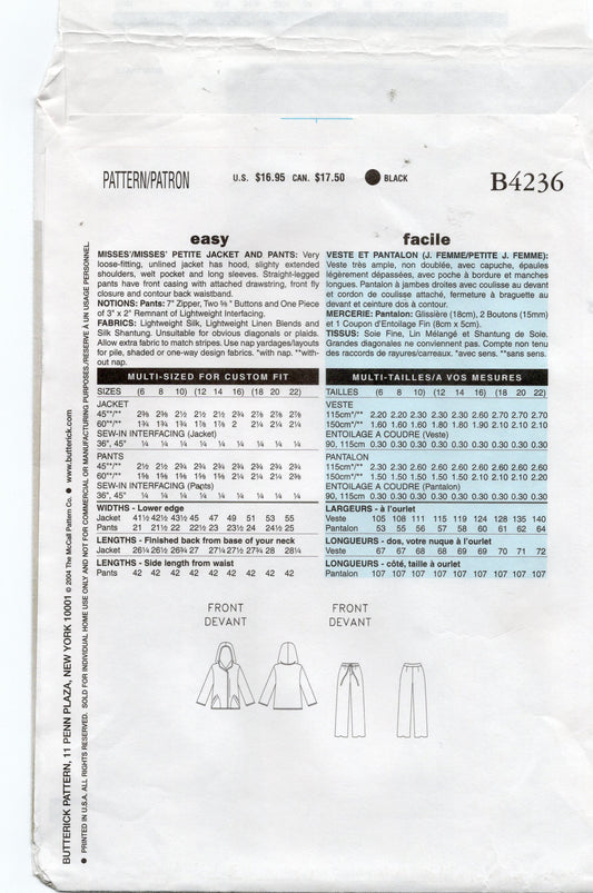 Patrón de costura agotado para chaqueta y pantalones casuales con capucha para mujer Butterick 4236 ELLEN TRACY, talla 18, 20, 22, sin cortar, pliegues de fábrica