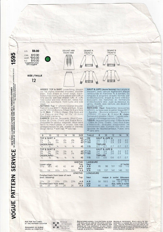 Patrón de costura vintage de los años 80, diseñador estadounidense Vogue 1595 BILL BLASS, blusa fruncida y falda ajustada con parte delantera fruncida, talla 12, busto 34 pulgadas, sin cortar, doblado de fábrica