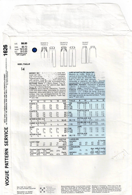 Patrón de costura vintage de los años 80, sin cortar, doblado de fábrica, para falda cruzada ajustada y pantalones plisados de pierna cónica de CALVIN KLEIN, diseñador estadounidense Vogue 1626