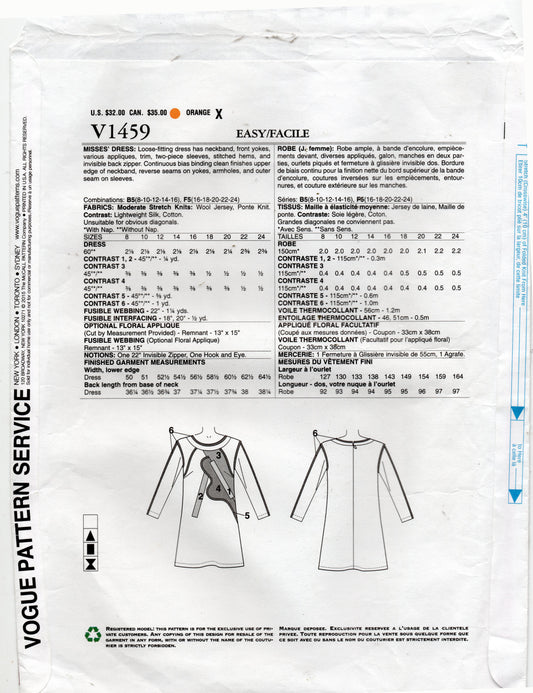 Patrón de costura de vestido con apliques elásticos en la parte delantera para mujer de Vogue American Designer V1459 KOOS Van Den Akker, agotado, talla 16-24, sin cortar, doblado de fábrica