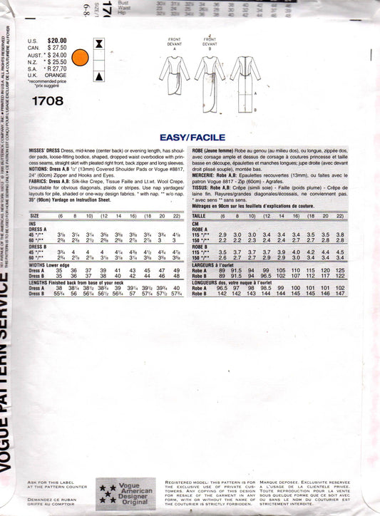 Patrón de costura vintage de los años 90 para vestido de noche cruzado para mujer TOM & LINDA PLATT, diseñador estadounidense Vogue n.° 1708, talla 6 a 10, doblado de fábrica y sin cortar