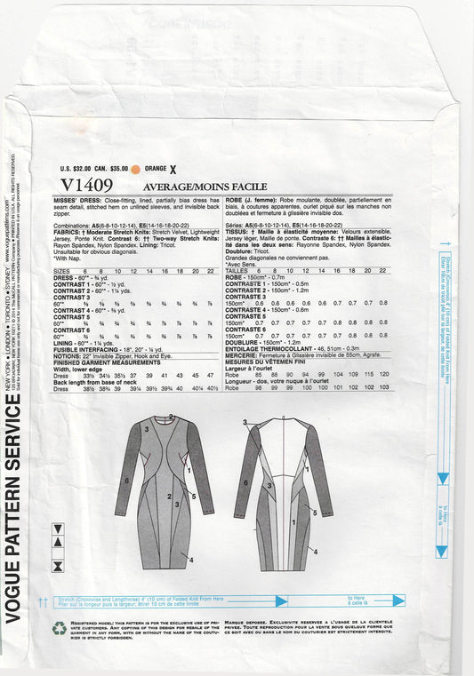Patrón de costura agotado para vestido de noche con paneles y bloques de color elástico de la diseñadora estadounidense Vogue 1409 DONNA KARAN NEW YORK, tallas 6 a 14, doblado de fábrica y sin cortar