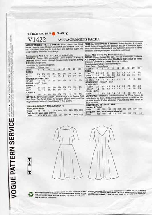 Patrón de costura agotado para vestido con enagua para mujer TRACY REESE, diseñador estadounidense Vogue 1422, talla 14-22, sin cortar, doblado de fábrica
