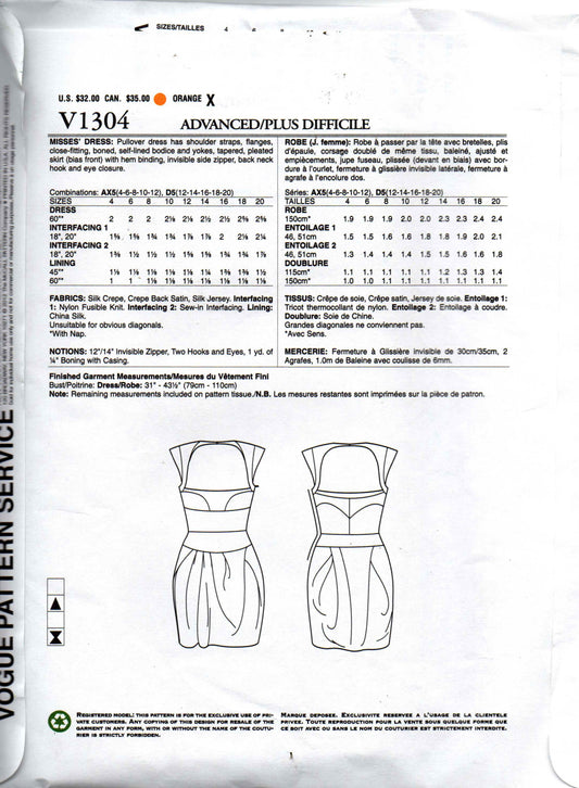 Patrón de costura de vestido con lazo delantero para mujer de Vogue American Designer V1317 CHADO Ralph Rucci, agotado, talla 16-24, sin cortar, doblado de fábrica