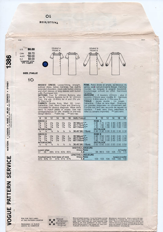 Patrón de costura vintage de los años 80 para vestido con botones laterales de John Anthony, diseñador estadounidense Vogue, talla 10 o 12, n.° 1386