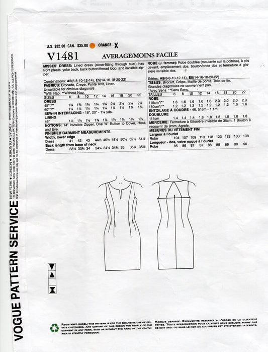 Vogue American Designer 1397 TRACY REESE Womens Lined V Back Dress with Front Pockets Out Of Print Sewing Pattern Sizes 6 - 14 UNCUT Factory Folded