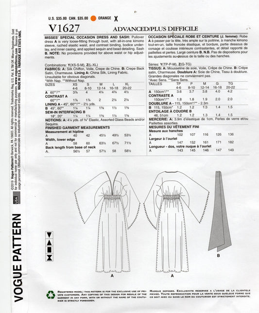 Patrón de costura para vestido kimono de noche para mujer y faja de la diseñadora estadounidense Vogue V1627 ZANDRA RHODES, tallas XS-M o L-XL, sin cortar, doblado de fábrica