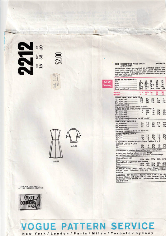 Patrón de costura vintage de los años 60, diseño Vogue Couturier 2212, modelo raro, para vestido acampanado de cintura alta y chaqueta de cuello ancho para mujer de Belinda Bellville, talla 16, busto de 38 pulgadas, sin cortar, doblado de fábrica
