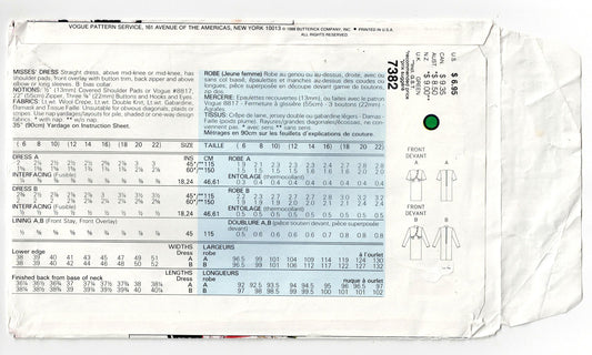 Vogue Career 7382 Womens Straight Dress with Asymmetric Overlay 1980s Vintage Sewing Pattern Size 6 - 10 UNCUT Factory Folded