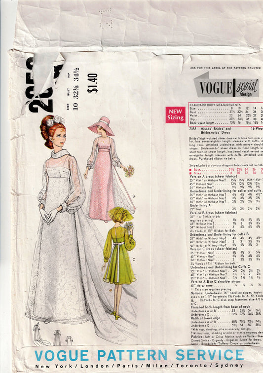 Vogue Bridal Design 2058 Womens High Waisted Sheer Overlay Wedding & Bridesmaids Dress 1960s Vintage Sewing Pattern Size 10 Bust 32.5 inches UNCUT Factory Folded