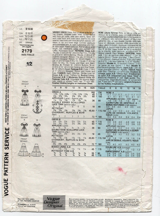 Patrón de costura original Vogue Bridal 2179 para vestido de novia con mangas abullonadas y enagua para mujer, años 80, talla 12, busto 34 pulgadas, sin cortar, doblado de fábrica