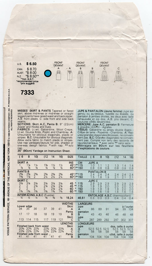 Patrón de costura vintage de los años 80 para faldas y pantalones plisados de cintura alta para mujer Vogue Career 7333, talla 12, cintura 26,5 pulgadas