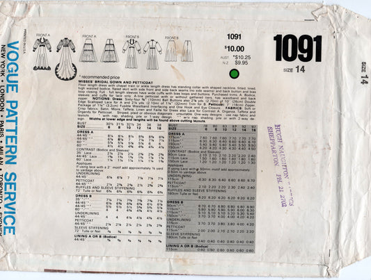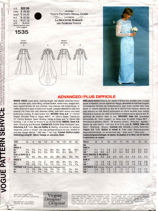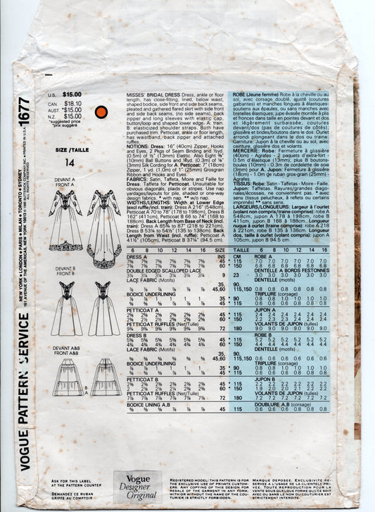Patrón de costura original de Vogue Bridal 1677 para vestido de novia y enagua para mujer, años 80, talla 14, busto de 36 pulgadas, sin cortar, doblado de fábrica
