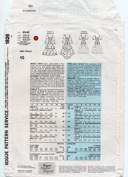 Patrón de costura vintage de los años 80 para vestido de noche de dama de honor para mujer con corpiño fruncido con ballenas, modelo original de Vogue Bridal 1826, talla 10, busto de 32,5 pulgadas