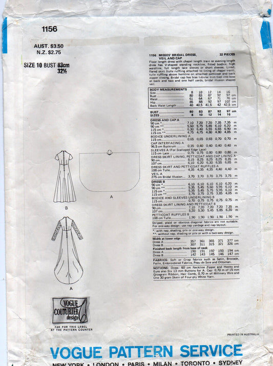 Patrón de costura vintage de los años 70 para vestido de novia de talle alto con velo y cofia para mujer de Vogue Couturier Design 1156 BELINDA BELLVILLE, talla 10, busto 32 1/2 pulgadas