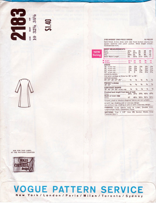 Patrón de costura vintage de los años 60, talla 10, sin cortar, doblado de fábrica, para vestido de abrigo asimétrico con botones de SYBIL CONNOLLY, diseño de Vogue Couturier 2183