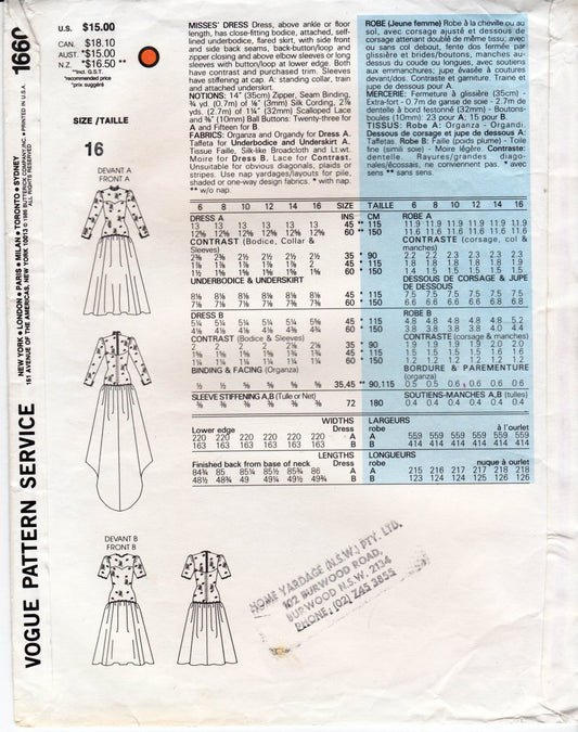 Patrón de costura original de Vogue Bridal 1660 para vestido de novia de talle bajo para mujer, largo hasta el suelo o cola, dobladillo con volantes, años 80, talla 16, busto 38 pulgadas