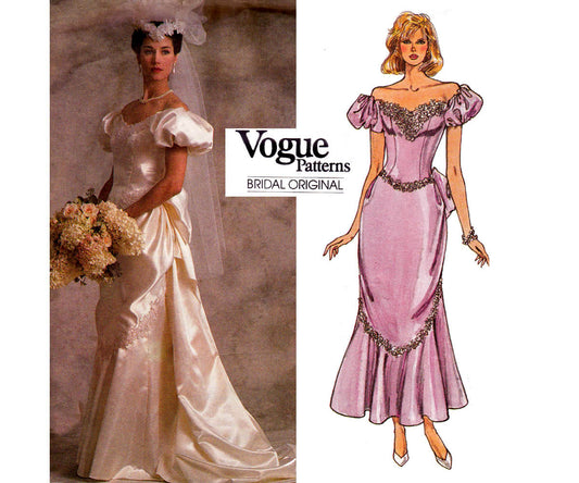 Patrón de costura original de Vogue Bridal 1679 para vestido de novia de talle bajo con cola o de longitud más corta, para mujer, de la década de 1980, talla 12, sin cortar, doblado de fábrica