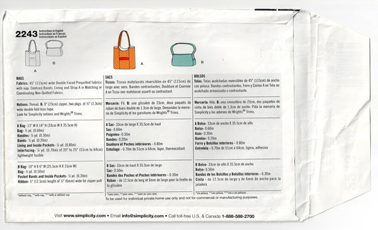 Patrón de costura agotado para bolso de compras y bolso de mano para mujer Simplicity 2243, sin cortar, doblado de fábrica