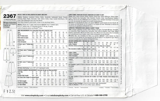 Patrón de costura agotado para pantalones cargo y faldas de pierna ancha o abullonada para mujer Simplicity 2367, talla 6-14, sin cortar, doblado de fábrica