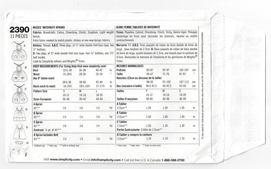 Patrón de costura de delantales de maternidad para mujer Simplicity 2390, agotados, talla 12-20, sin cortar, doblados de fábrica