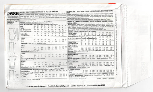 Patrón de costura Simplicity 2586 CYNTHIA ROWLEY para mujer, vestido tipo túnica, cinturón y diadema, agotado, talla 6-14 o 14-22, sin cortar, doblado de fábrica