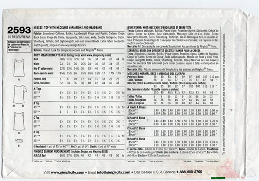 Patrón de costura agotado para blusas y diademas fruncidas para mujer de Simplicity 2593 CYNTHIA ROWLEY, talla 6 a 14, sin cortar, doblado de fábrica