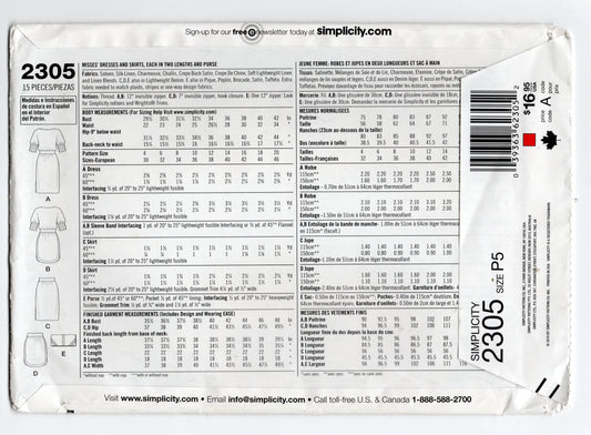 Patrón de costura Simplicity 2305 de CYNTHIA ROWLEY para vestido, blusa, falda y bolso para mujer, agotado, talla 12-20, sin cortar, doblado de fábrica